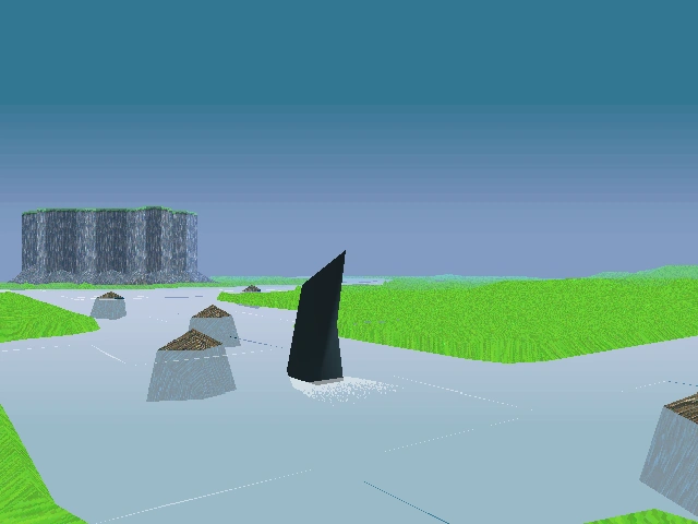 The fin of a large black aquatic creature can be found in one of the rivers of the The Natural World. Approaching will cause it to move.