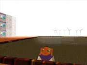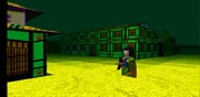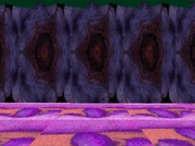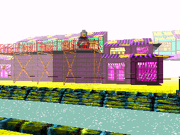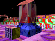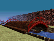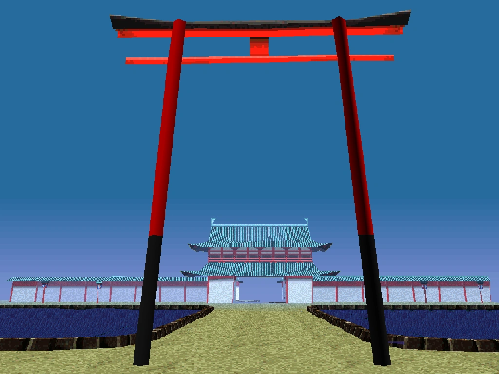 Downer textures change the ground to orange and grass to a warped orange texture. Buildings are a red and blue warped pattern with black panelling and a warped green roof. Previously brown buildings are the same but with a warped texture. Kyoto walls have a blue and red warped overlay similar to the buildings textures. The Zen garden has a warped stone ground with yellow and blue stones. The wall is identical to the building walls with a green and purple warped roof. The small wall is red and striped with black. Fences and the apartment buildings are a dull rainbow colour in circular patterns. Bridges have an orange tint with a green mottled texture and the railings have a warped overlay. The water is light red.