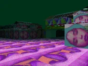 Sexual textures change the ground to an image of a pink mouth and tongue on an orange background and grass to multiple images of an open mouth. Buildings are bright images of female figures in purple, blue, red and green. Kyoto walls are an image of a pixellated woman in pink and orange with an orange roof. The Zen garden raked ground is a green woman's face with a pink background and the stones are an infrared styled image of a woman. The walls are orange with pink shapes and the roof light blue with red text. The small wall is multicoloured open mouths. Fences are a red and green image of a woman. The apartments are many multicoloured images including a Happy Town styled face, women's faces and fists. Bridges are what looks like a pink butt while the railings are the same image as the Kyoto walls. The water is bright green.