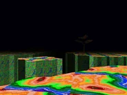 Sexual textures change the ground to colourful squares and Happy Town styled faces and cliffs to multicoloured male faces. Trees have purple leaves and fir trees have a similar pattern of squares to the grass. The water is a dark blue-pink. Bridges have multicoloured fists with railings that seem to have a pixellated woman on them. The Bright Moon Cottage entrance is purple with a green and bright pink wall and a distorted yellow and blue pattern. The Pit & Temple entrance has small Happy Town styled faces in squares and red trees. The Violence District entrance only changes the awning styled front, now with a distorted green figure on a teal background. The Kyoto entrance is blue and teal with bright multicoloured infrared style pillars. The walls are multicoloured images of a woman's face. The roof is a distorted man's face. The Happy Town entrance is a cut off Happy Town styled face.