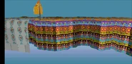 The Natural World is a large grassy area with vast pits, rivers, trees, cliffs and other landmarks. It also features desert and rocky or muddy areas. Some areas are linked with wooden bridges with railings. The trees come in two types, brown, slim trees with sparse green leaves and fir trees. The former trees also come in huge versions. Some bodies of water can be walked over, these lack a ridge at the waters edge. They also have submerged rocks in. A large body of water holds a submerged city underneath a long bridge.