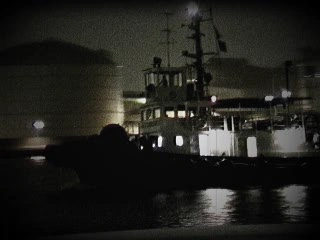 A boat floats by a dock at night, and a fire is shown, while the Long Tall Eyelash by Osamu Sato plays. A film grain effect is applied. |