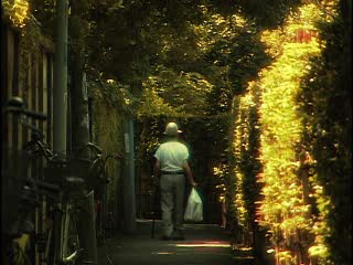Going down a canal under a road, various shots of statues are shown. A film grain effect is applied. |